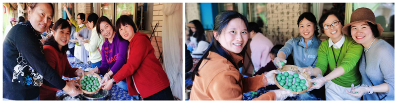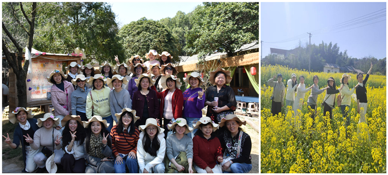 参观结束后,大家驱车前往风景如画的周边庄园,开启了一场别开生面的传统文化与手工艺术体验之旅。在庄园师傅的指导下,大家开始兴致勃勃地揉面、包馅、搓圆,制作传统美食青团,并互相交流着制作技巧,现场欢声笑语不断。午后,大家化身为心灵手巧的“设计师”,通过充分发挥想象力,精心构思布局,将一朵朵、一簇簇美丽的永生花巧妙地粘贴在帽檐上。一顶顶原本普通的草帽,被装点得独具匠心、色彩斑斓,或清新淡雅,或热烈奔放,无不彰显着女职工们独特的审美情趣和对美好生活的热爱。在和煦的春风与欢声笑语中,大家戴上自己亲手制作的永生花帽驻足拍照,或品尝着自己亲手制作的软糯香甜的青团,身心都得到了充分的放松。